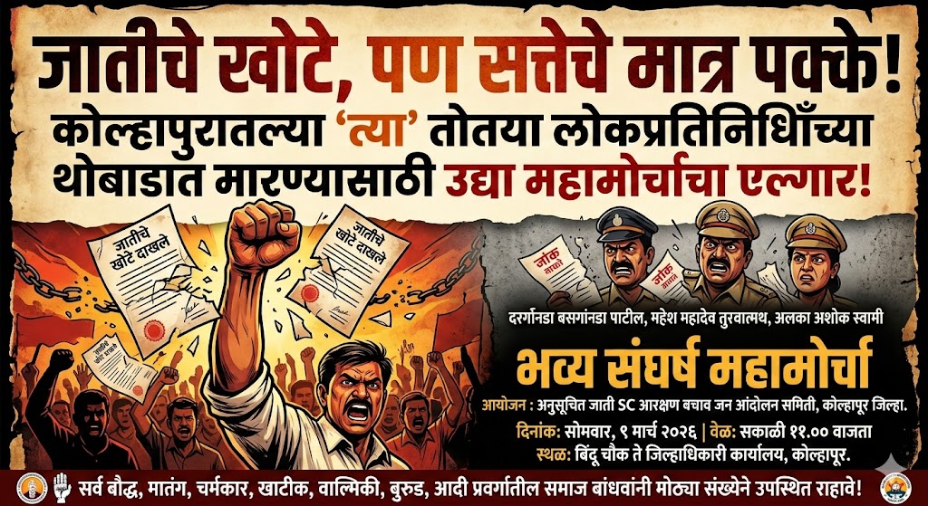 तमाम बौद्ध, मातंग, चर्मकार, खाटीक, वाल्मिकी, बुरुड आणि इतर सर्व दलित बांधवांना आमचा पुकारा आहे—आता घरात बसून चालणार नाही! तुमच्या मुलांचे भविष्य, त्यांच्या नोकऱ्या आणि त्यांचा स्वाभिमान या बोगस लोकांनी धोक्यात आणला आहे. या अन्यायाचा कडेलोट करण्यासाठी उद्या कोल्हापुरात जनसागराचा महापूर लोटला पाहिजे!